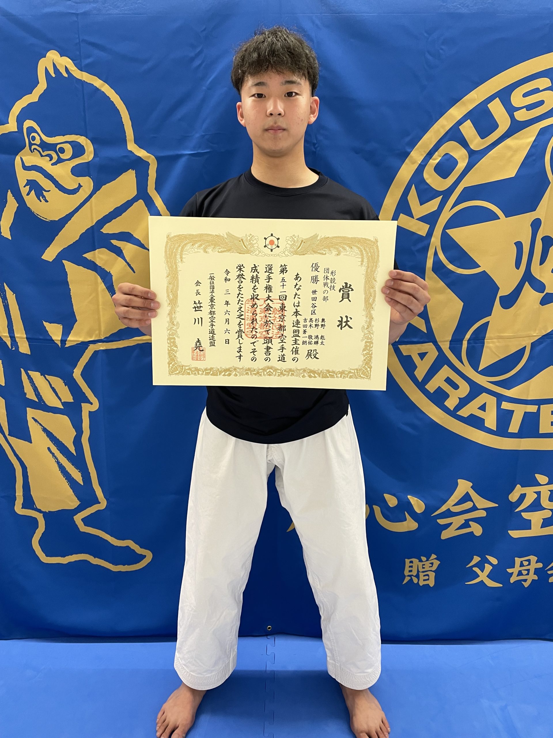 東京都空手道選手権大会 団体形優勝 2021.09.01 2021年6月6日に行われた東京都空手道選手権大会 煌心会からは 奥野 彪太 が参加した 世田谷区のチームは 形競技 団体の部 で 優勝をいたしました。 世田谷区の各道場で選ばれた選手達、普段は別の道場で、コロナ禍でただでさえ練習時間が限られている中、素晴らしい成績出すことができました。 関係者の皆様に御礼を申し上げます。